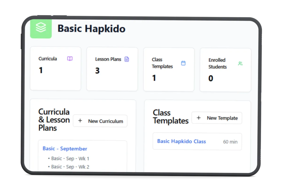 Set up your martial arts curriculum by entering program info, class types, and core techniques.